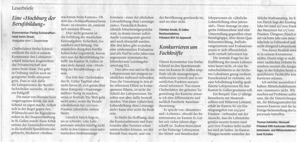 Nach dem Kampf ist vor dem Kampf, denn jetzt wird es darum gehen, in Verhandlungen mit dem Bildungsdepartement für die Interessen der Berufsfachschul- und Berufsmittelschullehrpersonen das maximal Mögliche herauszuholen. Dass dieser Kampf auch kein leichter werden wird, darauf gab uns das St. Galler Tagblatt einen kleinen Vorgeschmack. In selten polemischer Weise bediente Chefredaktor Stefan Schmid Ressentiment gegenüber uns Lehrpersonen. Und dies notabene am Eröffnungstag der Session. Immerhin zeigte sich das Tagblatt bereit, eine Replik noch während der laufenden Session - aber doch zu spät - abzudrucken.